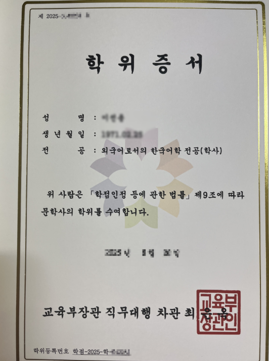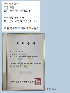후기 커뮤니티 후기로 검증하세요. 자격증이 손에 잡히는 순간 모든 우여곡절이 싸~악 사라졌어요. 작성자 GRADUS 작성일 2025-12-10 09:56 조회 73 성함 : 김O선 학위 : 학사학위 전공 : 외국어로서한국어학 목표 : 한국어교원자격증 2급 스토리 : 40대에 직장 다니며 밤마다 공부했던 시간이 떠오르네요. 오늘 아침 자격증이 도착했다는 메시지를 보는 순간 마음이 묵직하게 풀렸습니다. 중간에 흔들릴 때 상담에서 방향을 다시 잡을 수 있었던 게 큰 힘이 됐고요. 이제야 비로소 제 속도가 맞춰진 느낌입니다. 0 0 전체 0 추천순 작성순 최신순 작성자 비밀번호 사진 첨부파일 « 부천대 간호학과 합격했네요. 수고하셨습니다. 한국어 교원2급자격증 영롱하네요. » 글수정 글삭제 후기 전체보기