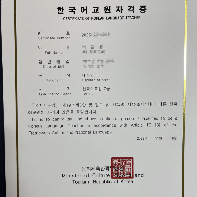 후기 커뮤니티 후기로 검증하세요. 한국어 교원2급자격증 영롱하네요. 작성자 GRADUS 작성일 2025-12-16 10:50 조회 215 [자격증으로 방향이 또렷해진 순간] 성함 : 이O용 학위 : 학사학위 전공 : 외국어로서한국어학 목표 : 한국어교원 2급 스토리 : 이미 학원에서 가르치고 있었지만 자격은 늘 마음에 걸렸어요. 학사 과정과 병행해 준비하며 기준이 정리됐고, 상담을 통해 놓치던 부분을 점검할 수 있었어요. 자격증을 손에 쥐니 수업에 대한 자신감이 확실히 달라졌습니다. 0 0 전체 0 추천순 작성순 최신순 작성자 비밀번호 사진 첨부파일 « 자격증이 손에 잡히는 순간 모든 우여곡절이 싸~악 사라졌어요. [경축] 드디어 건강운동관리사가 되다. » 글수정 글삭제 후기 전체보기