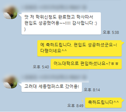 후기 커뮤니티 후기로 검증하세요. 목표했던 고려대 세종캠퍼스 편입 합격하다 작성자 GRADUS 작성일 2025-10-22 12:41 조회 109 성함 : 김O석학위 : 전문학사전공 : 경영목표 : 일반편입스토리 : 대학교 자퇴 후, 꿈이 생겨서 목표하는 전공이 개설된 고려대 세종캠퍼스 일반편입을 목표하게 됐습니다. 엄청난 목표라고 생각하지 않을 수 있지만 저에겐 상당한 성취를 가져다 주고 꿈을 이어나갈 수 있는 발판이 될겁니다. 0 0 전체 0 추천순 작성순 최신순 작성자 비밀번호 사진 첨부파일 « 20대 후반 직장 다니며 서일대 간호학과 대졸자전형 합격 노력의 결실, 첫 학사학위 » 글수정 글삭제 후기 전체보기