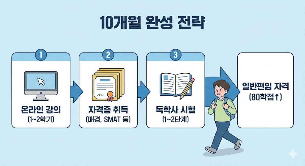 고졸 상태 그대로는 편입 원서를 못 넣죠. 자격을 먼저 만들어야 하거든요. 그 자격을 만드는 데 10개월이면 충분합니다. 수능 다시 보는 것보다 빠를 수도 있어요.