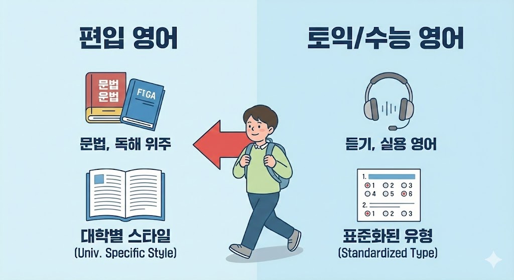 문법, 독해 비중이 높고, 대학별로 출제 스타일이 달라요. 학점 준비하면서 영어도 같이 시작해야 하는 이유입니다. 나중에 몰아서 하면 늦어요.