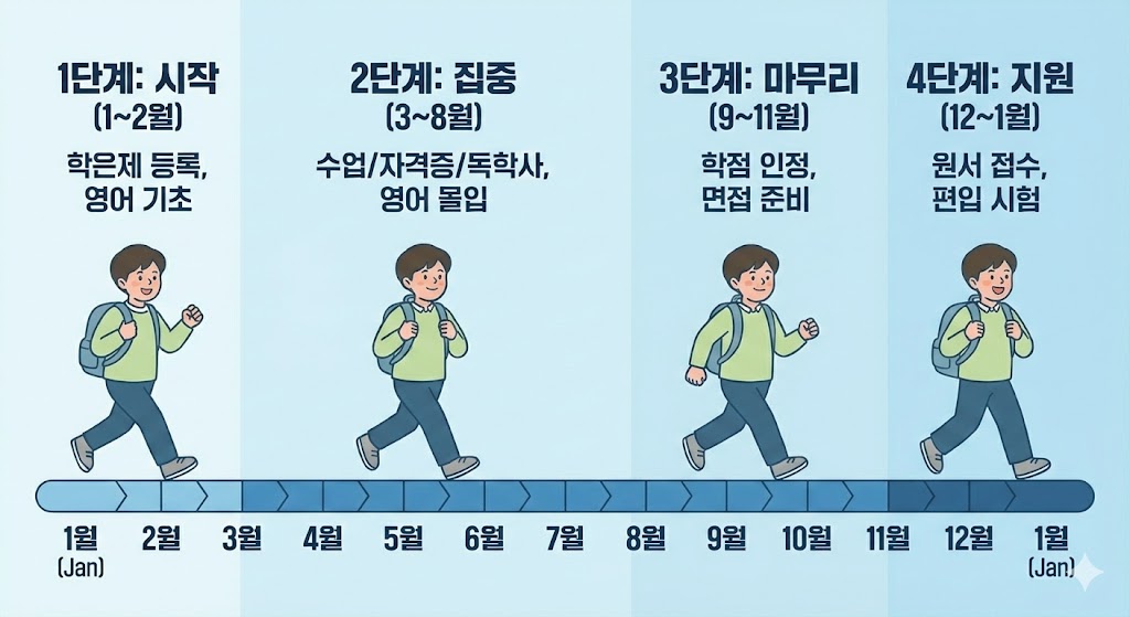 - 1~2월: 학점은행제 등록, 1학기 수업 시작. 편입 영어 기초 시작.