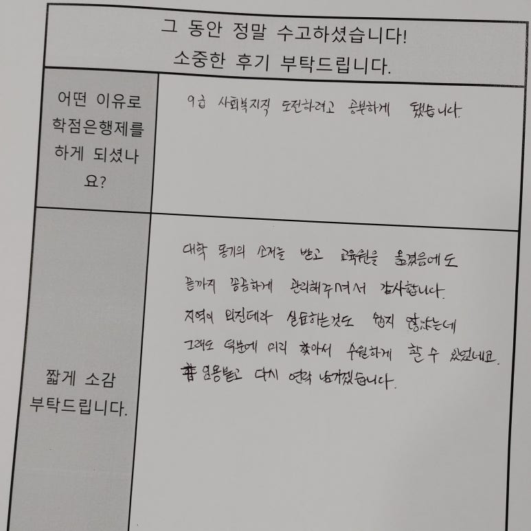 최소 1년을 학점은행제에 투자해야 되는 만큼 쉽지 않은 결정이었지만, 결국 해냈습니다. 꿈꾸면 이룰 수 있다는 건 남 얘기인 줄 알았는데, 이렇게 현실이 돼서 너무 좋습니다!