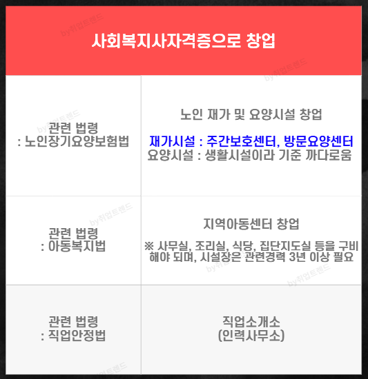 요즘 어린이집이 폐원하고 그 자리에 주간보호센터, 방문요양센터가 설립되고 있습니다. 창업은 정년이 없으며, 사회복지 분야 특성상 가족기업으로 운영하기 매우 좋습니다.