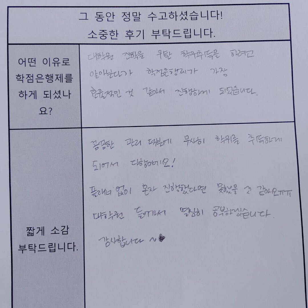 대학교를 1년 다니고 자퇴, 사회에서는 고졸이었지만 학점은행제에서는 전적대 활용이 가능했습니다. 고졸자는 2년으로 알고 있었는데, 이렇게 제도를 제대로 알고 있는 플래너에게 맡기니 1년 조금 더 걸려서 2년제 졸업장 그리고 사회복지사2급자격증을 취득할 수 있었습니다.