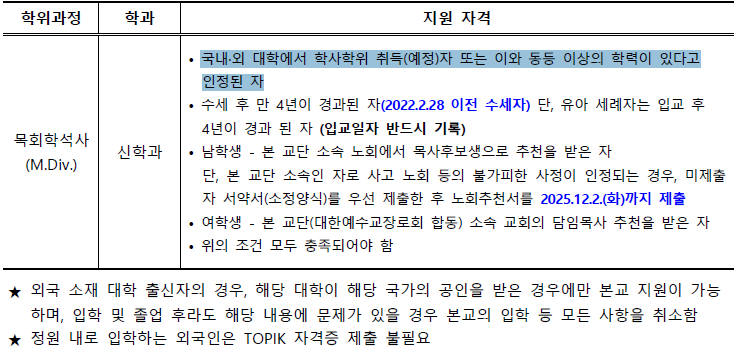 - 신학대학원의 지원자격 요건을 정확히 확인하고