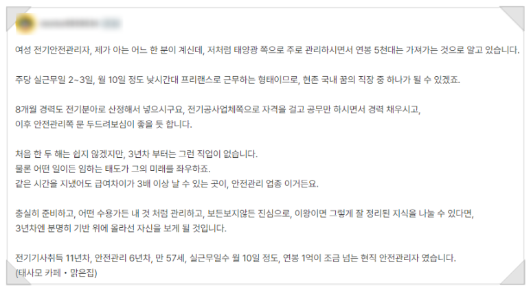 채용 포털에 올라와 있는 전기안전관리자 전망 관련 질문에 대한 답 중 하나를 가져 왔습니다.