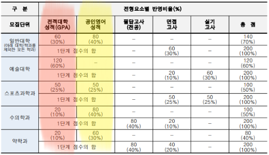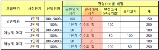 지원자격은 거의 동일하기 때문에 생략하겠고요. 다음으로 전적대 및 토익(공인영어성적) 비중입니다.