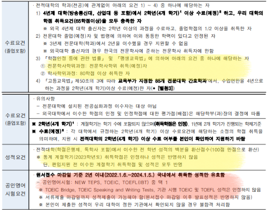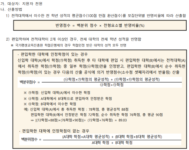 적어도 전북대는 비중이 꽤 높다고 말할 수 있을 것 같습니다. 참고로 대학교 자퇴 후 학점은행제 전문학사 혹은 학사학위로 지원자격을 만드는 경우 자퇴한 곳의 성적도 포함된다는 점을 염두해야겠습니다.