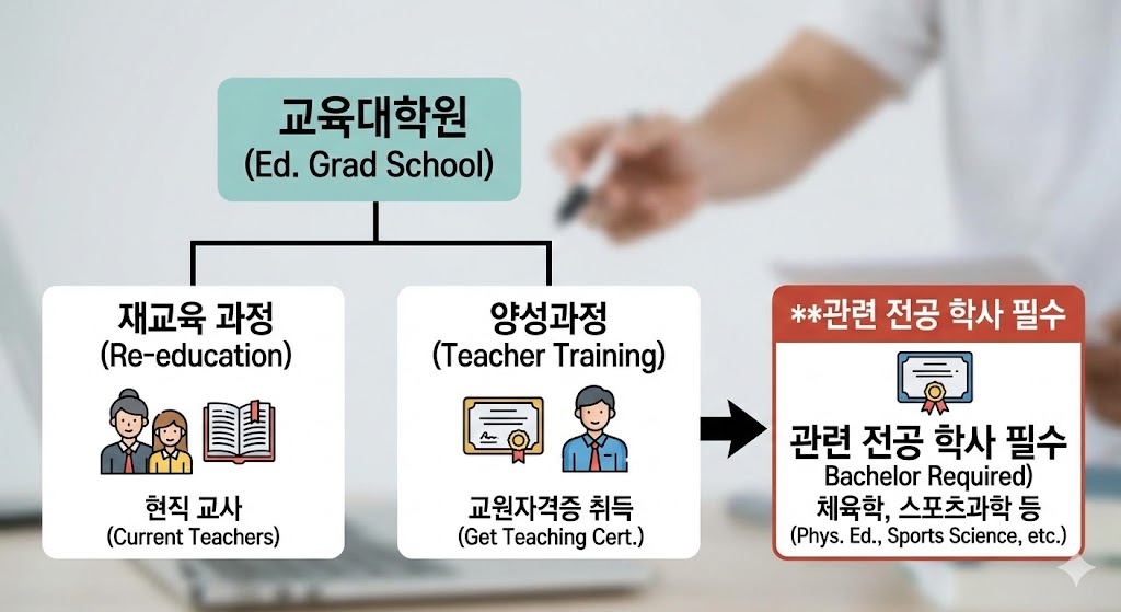 교육대학원은 크게 두 가지로 나뉩니다. 하나는 현직 교사의 재교육 과정, 다른 하나는 교원자격증을 새로 취득하는 양성과정이에요. 체육교사가 목표라면 후자를 선택해야 합니다.