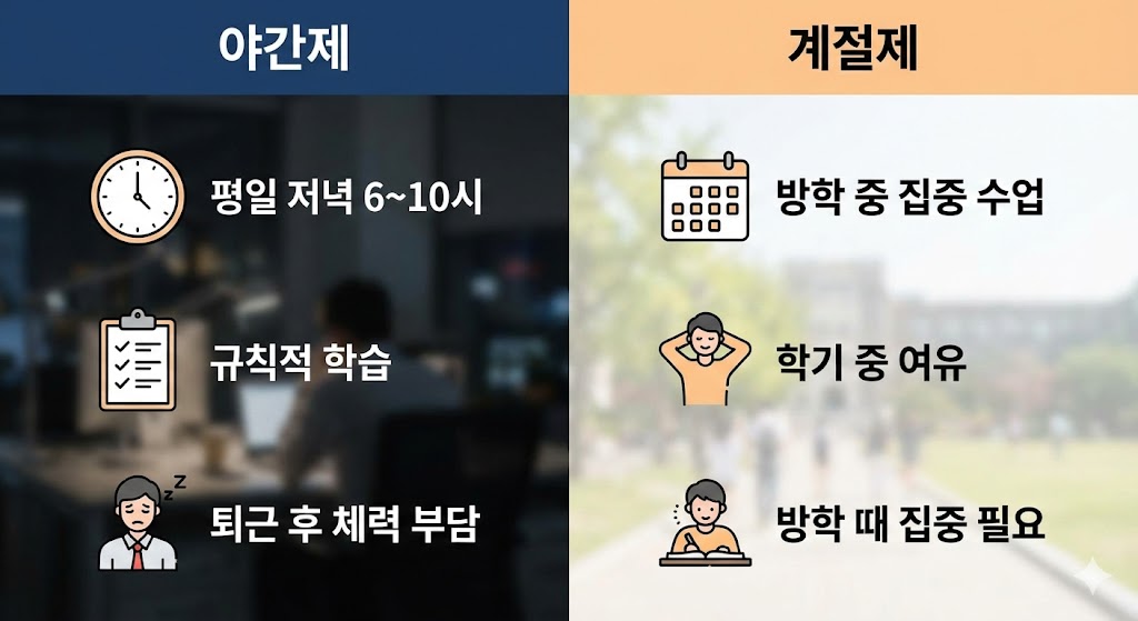 | 단점 | 퇴근 후 체력 소모 | 방학 때 집중 필요 |