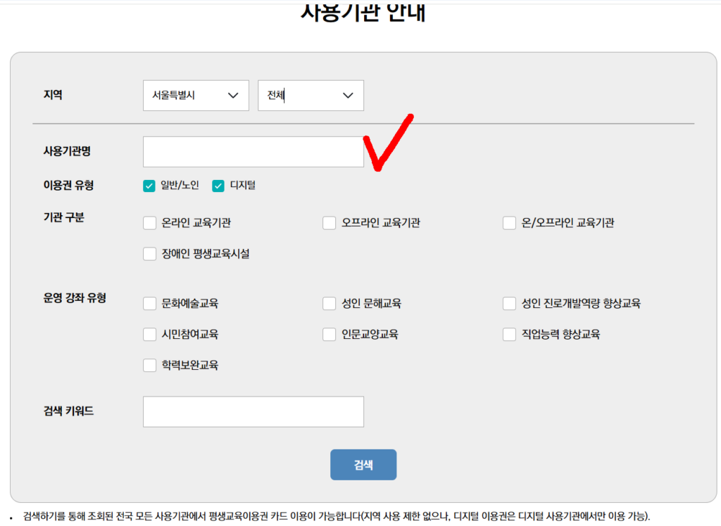 Q: 1) 거주지는 서울인데, 타지역에 있는 평생교육기관에 사용 가능한가요?
