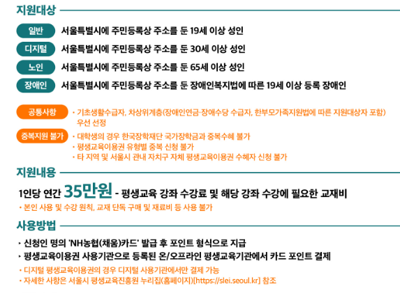 이용권은 3가지로 나뉘고, 1인당 35만원(우수이용자는 70만원까지)까지 사용할 수 있는데요. 평생교육이용권 발급기준이 다릅니다.