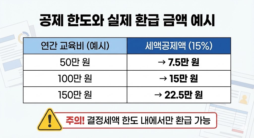 예를 들어 결정세액이 10만 원인데 교육비 공제액이 15만 원이면, 실제 환급은 10만 원까지만 됩니다.