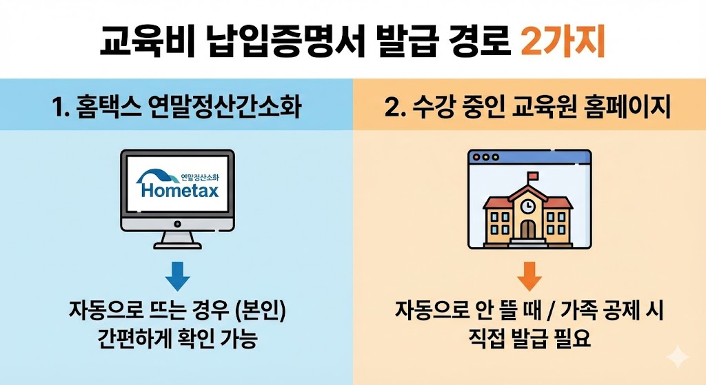 다만 서류 발급 경로가 여러 개라 헷갈리는 분들이 많아요. 홈택스에서 자동으로 뜨는 경우도 있고, 국가평생교육진흥원에서 직접 떼야 하는 경우도 있어요.
