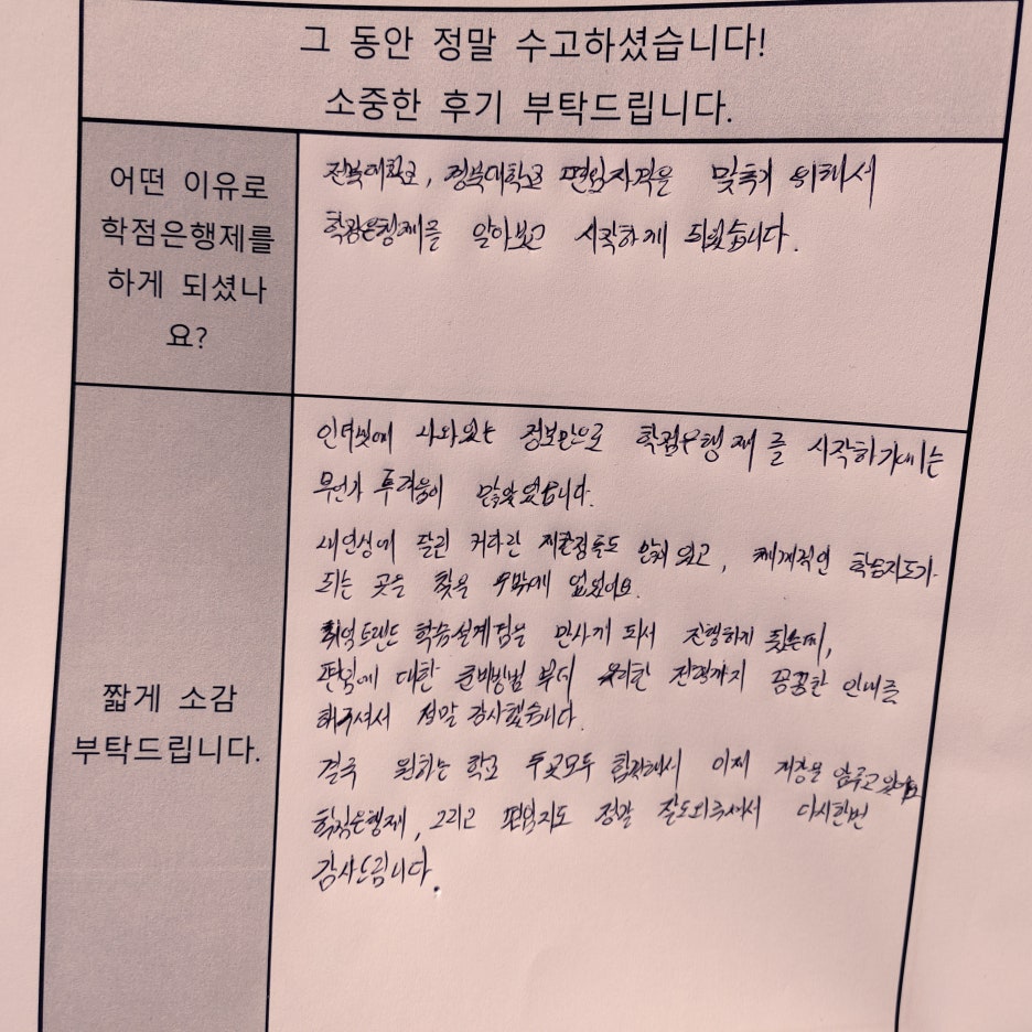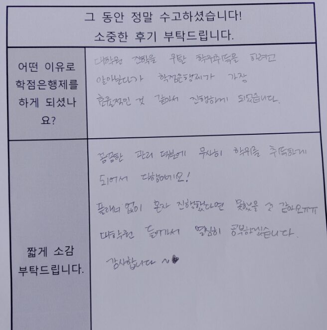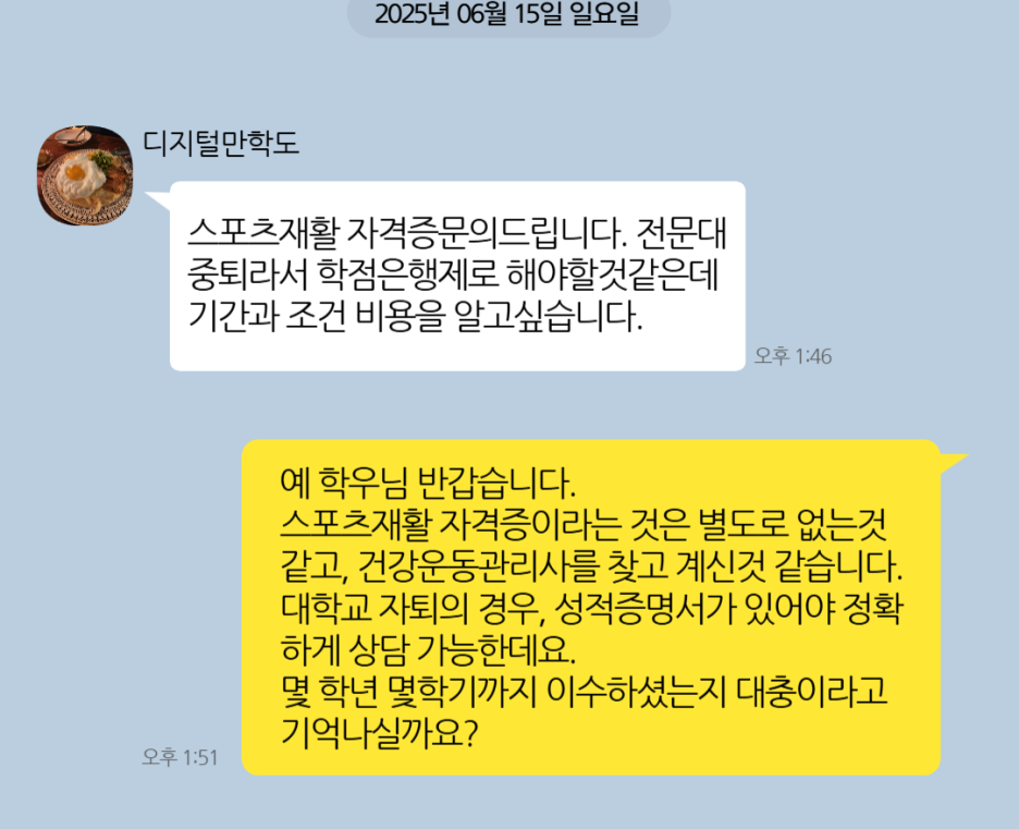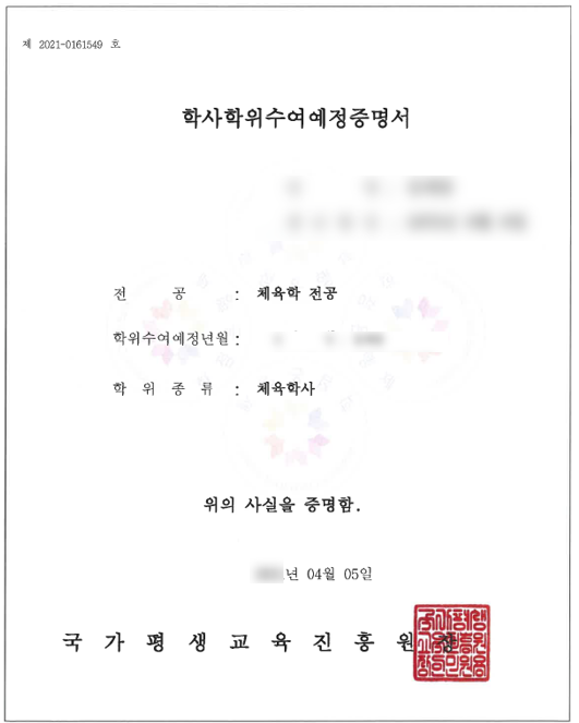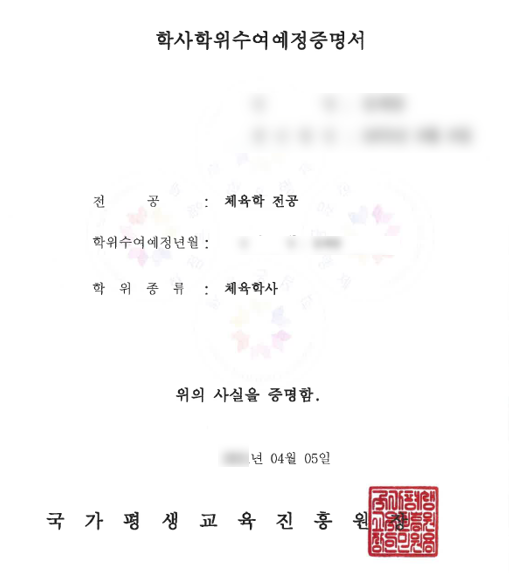 체육학 특수 전공 편하다 저렴하다 짧다온라인 체육학과 “건강운동관리사 대학편입 체육교육대학원 진학“ 소개 비전공자에겐 그저 한 줄기 빛! 건강운동관리사 KATA KACEP 응시자격 체대편입 지원자격체육교육대학원 지원자격 위 세 가지의 공통점이 있습니다.바로 ‘체육 관련 대학 졸업장이 필요하다!’ 이제는 집이나 직장에서 온라인으로 체육학 전공 수업을 들을 수 있습니다.단기간, 저비용으로 4년제 졸업장 취득하는 법 핵심만 정리했습니다. Opportunities 체육학과 이런 기회가 건강운동관리사 KATA KACEP전문적인 운동지도자가 될 수 있는 자격증 시험 응시하려면 체육 관련 학위(전공) 필수 체대 체육교육 물리치료 간호 편입인서울 지거국 대학 일반편입 학사편입 지원자격은 학점은행제가 공식인 거 알죠? 체육교육대학원 포함 직장인대학원체육교육대학원은 관련학과 학사학위 필수! 야간 특수대학원 진학에 필수인 최소학력부터 학점은행제란? 2년제 레저스포츠 / 4년제 체육학과 교육부 정식 인가 교육기관에서 진행 필수수업·과제·시험 모두 온라인스포츠지도사 스포츠경영관리사 등 국가자격증 병행 시 등록금 절약, 기간 단축 최종학력 별 로드맵 들어가기 전 핵심 정리※4년제 학사학위 취득 기준1. 최종학력고졸 or 대학교 자퇴전문대졸업비전공 대졸2. 예상 기간1~3년1년~2년8~12개월3. 비용수업료 : 학점당 계산※ 매학기 타교육원 보다 ‘저렴한 이벤트‘!4가지약속드려요1) 5년차 이상 교육기관 멘토와 상담2) 맞춤형 1:1 학습설계3) 매학기 철저한 성적관리– 레포트 & 토론 참고문헌– 중간/기말 오픈북 참고자료4) 끝날때까지 꼼꼼한 사후관리 <졸업’예정’증명서로 자격증, 편입, 대학원 원서 접수 가능> 모범 사례 1년만에 끝낼 수 있다던데요? 소지 또는 취득 예정인 국가자격증 있다면 온라인수업만으로 학점을 채울 때와 국가자격증 취득을 병행했을 때 큰 차이가 있습니다. 생활/유소년/노인/전문/장애인 스포츠지도사, 스포츠경영관리사 국가자격증이 있다면 등록금 절약, 기간 단축에 큰 도움이 됩니다. “고졸인데, 1년만에 끝내는 방법 없나요?”이론 상으로는 가능. 그러나, 직장인들의 물리적 현실을 고려해야죠.※ 일반편입 준비생은 2년제 레저스포츠 전공 1년 과정 추천! “대졸자는 누구나 1년 만에 가능”생체2급 있다면 8개월만에도 가능! 당신의 진심 멘토 검증하고 상담받기 11년간 한결같이! 학생에게 진심인 전문가들이 여러분의 눈높이에서 꼼꼼하게 도와드려요.백문이 불여일견!상담하기 전 멘토 소개와 후기로 확실한 검증절차부터 밟는건 어떨까요? Review 소중한 학생들 후기