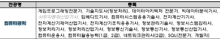 국가평생교육진흥원 고시로 올라와 있는 제25차 자격 학점인정 기준 중에 컴퓨터공학 학사학위에서 인정되는 국가자격증 종류입니다. 사무자동화산업기사는 흐릿하게 돼있죠? 빠졌습니다.