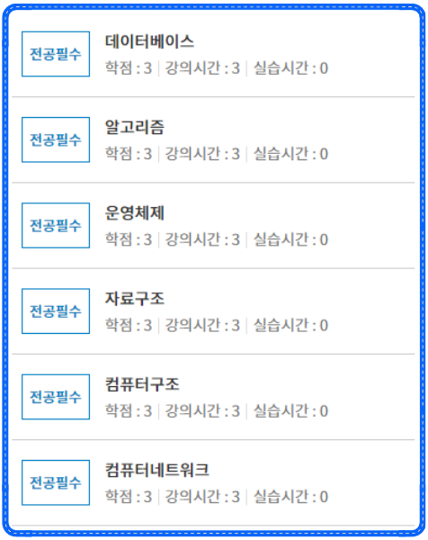 위 사진은 학점은행제 컴퓨터공학 표준교육과정에 있는 전공필수 과목 리스트입니다. 이러이러한 기초, 틀을 갖고 있는 전공이라는 것이죠.